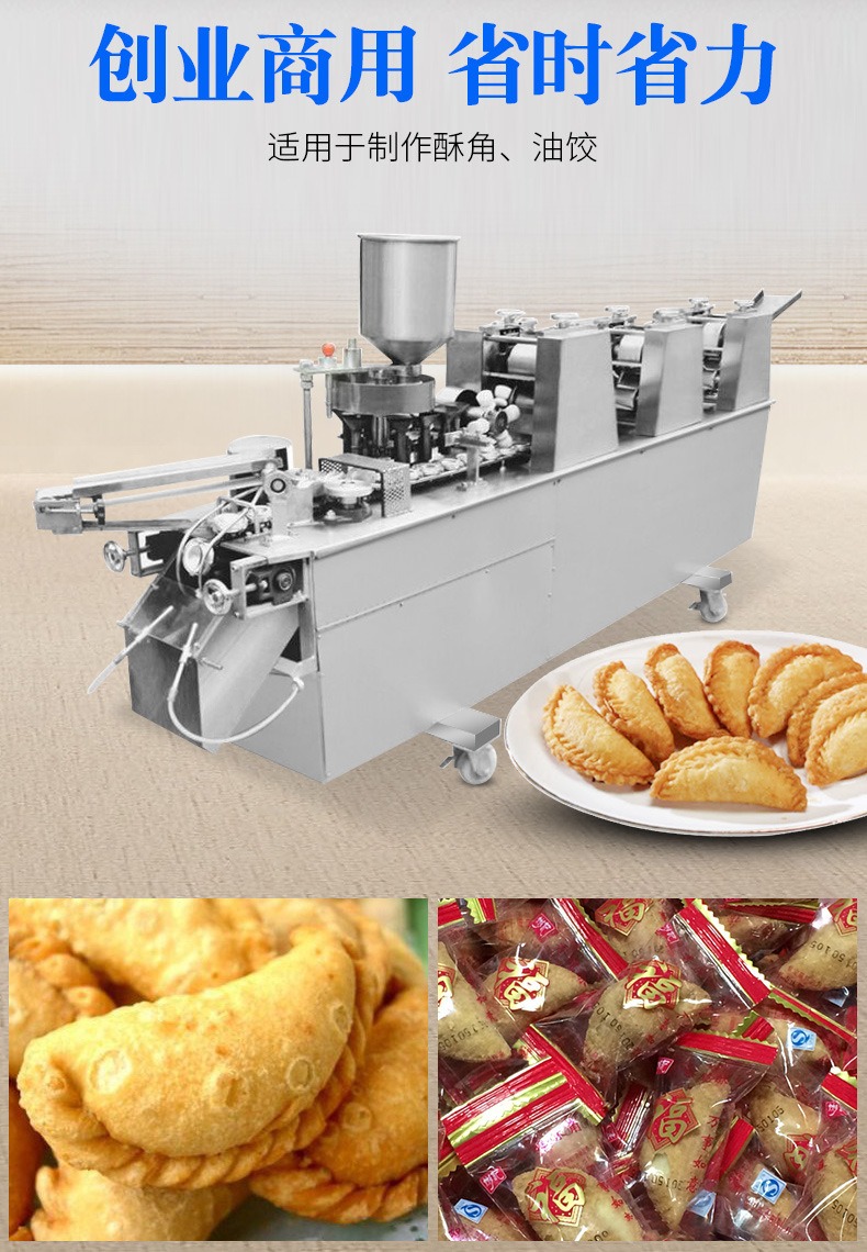 自动成型油饺机,创业商用、省时省力。适用于制作酥角、油饺。3000-4000每小时大产量。省力快速,做酥角、油饺的神器。自动撒粉 不粘机器。面粉均匀漏下,面皮不粘黏机器。